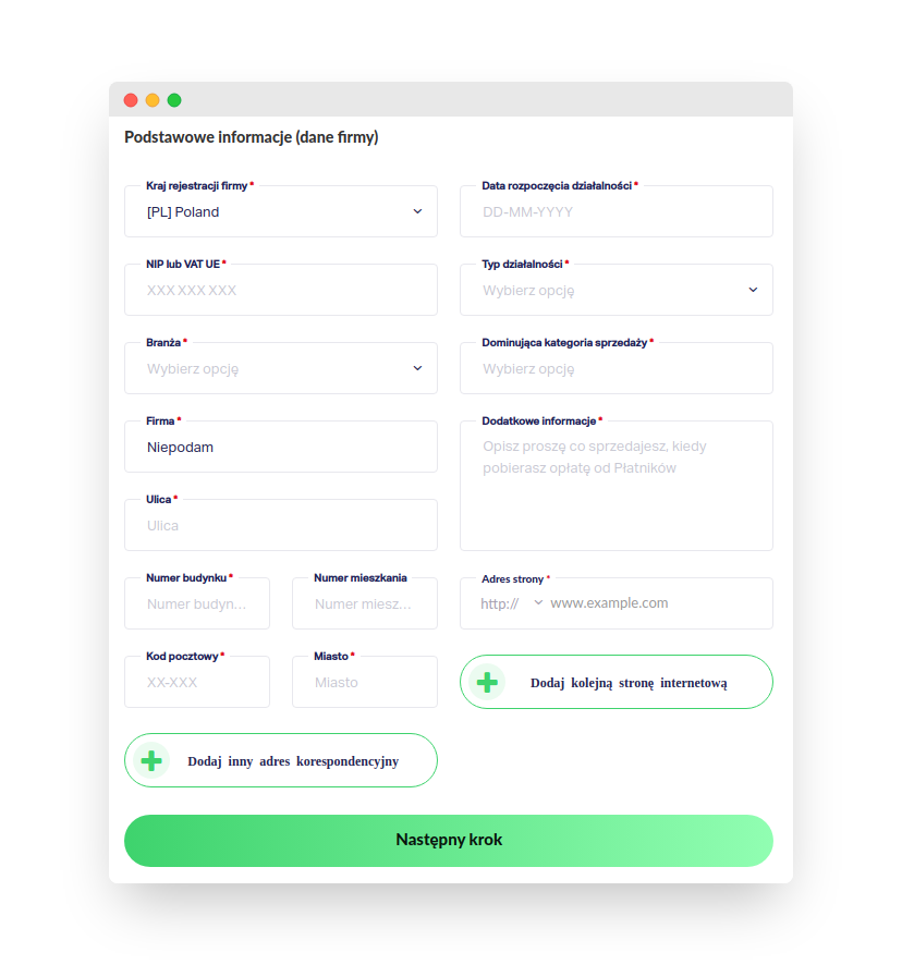 Wypełnij formularz zgodnie z prawdziwymi danymi o Twojej firmie.