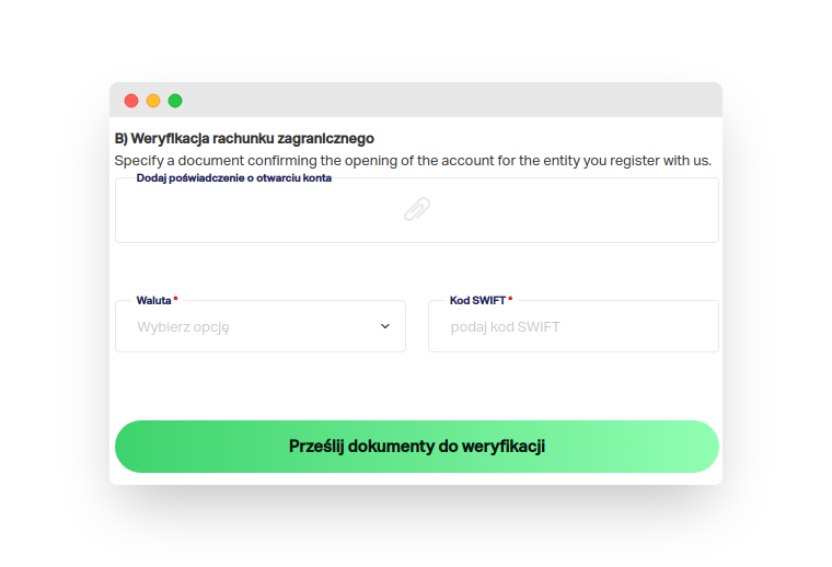 W przypadku posiadania rachunku za granicą, wypełnij formularz Weryfikacja rachunku zagranicznego.