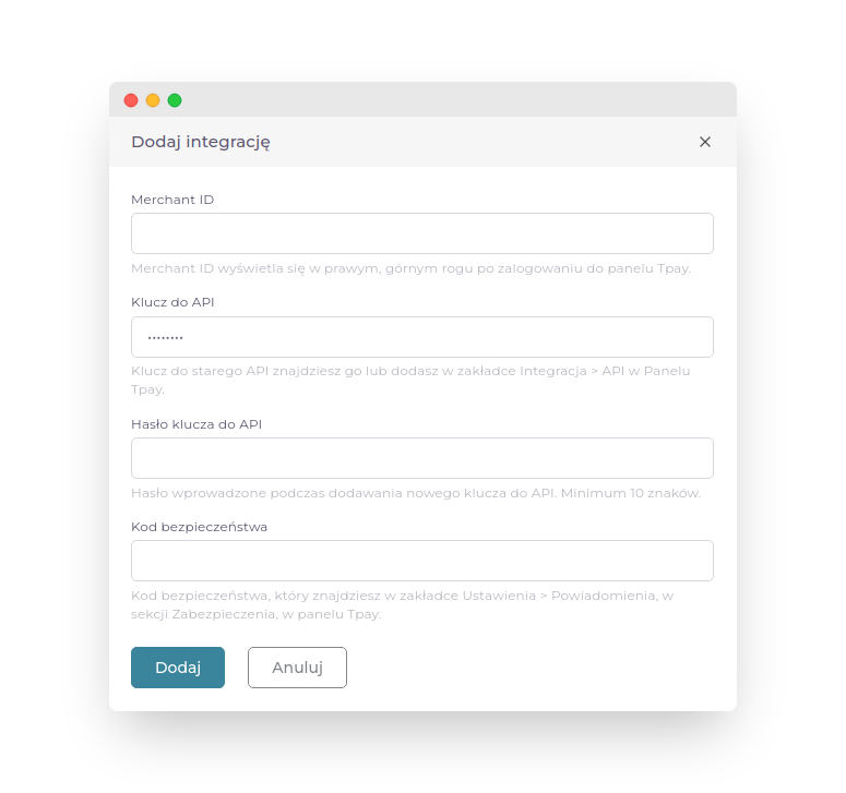 Aby dodać Klucz do API należy to zrobić w zakładce Integracja > API w Panelu Tpay, w sekcji "Klucze do starego API".