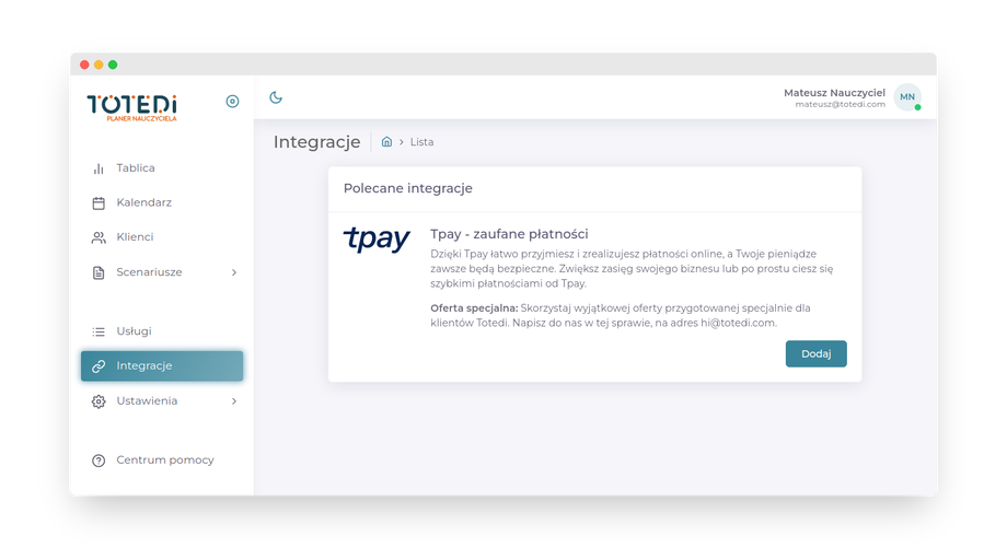 Po zweryfikowaniu Twojego konta, wypełnij formularz integracji w Totedi. W tym celu powinno się kliknąć w menu Integracje a następnie Dodaj, przy integracji Tpay.