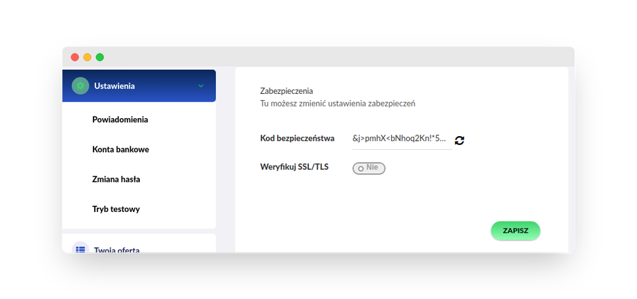 Kod bezpieczeństwa, który znajdziemy w zakładce Ustawienia > Powiadomienia, w sekcji Zabezpieczenia, w panelu Tpay.