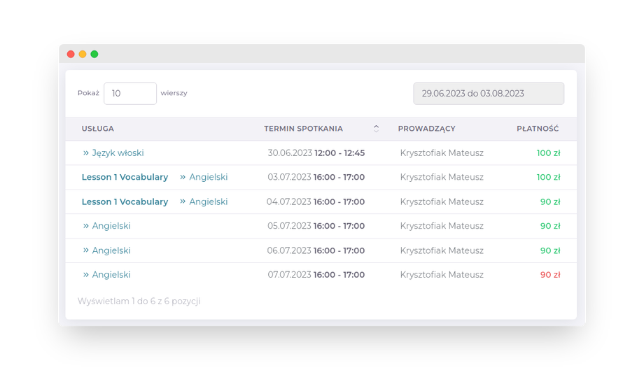 Klikając w poszczególne zajęcia przejdziesz do Widoku spotkania.