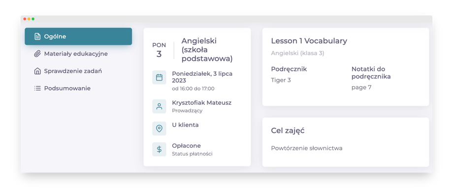 W zakładce ogólne wyświetlą Ci się podstawowe informacje, czyli data, czas trwania spotkania, forma spotkania oraz czy dane zajęcia są opłacone.