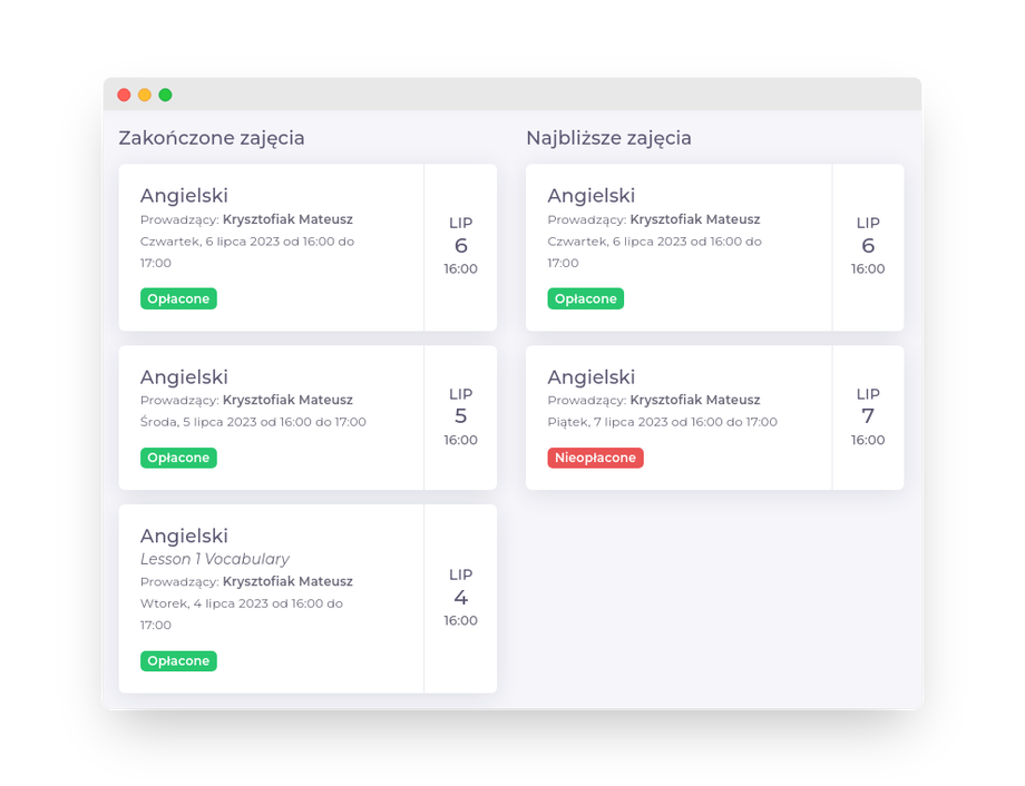 Na tablicy po zalogowaniu widać maksymalnie 3 zakończone i najbliższe spotkania z korepetytorami, oraz podstawowe informacje o nich.