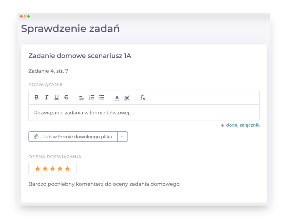 Może w swoim panelu wprowadzić rozwiązania zadania domowego w formie tekstowej lub wgrywając plik, np. zdjęcie kartki z rozwiązaniem zadania. Nauczyciel, z kolei sprawdzając rozwiązanie zadania domowego, może je ocenić w skali od 1 do 5.