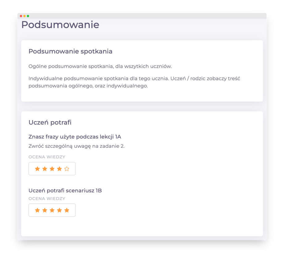 Miejsce, w którym znajdziesz podsumowanie spotkania przez nauczyciela. Znajdziesz tu również informacje o stanie wiedzy, która została zweryfikowana na kolejnych zajęciach.