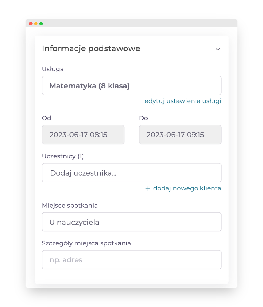 Zwróć uwagę, że informacje na temat spotkania wypełniają się automatycznie, na podstawie wybranej usługi.