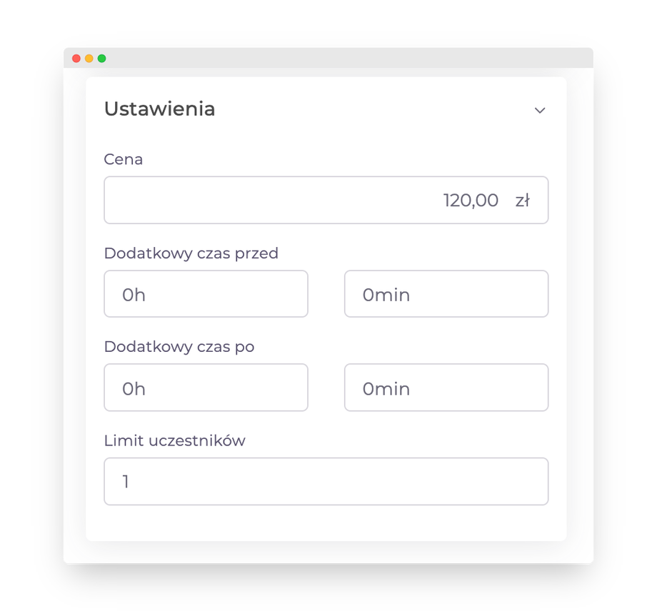 Istnieje możliwość nadpisania domyślnych ustawień usługi dla tego spotkania / cyklu spotkań. W tym celu, należy kliknąć edytuj ustawienia usługi pod polem wyboru usługi.