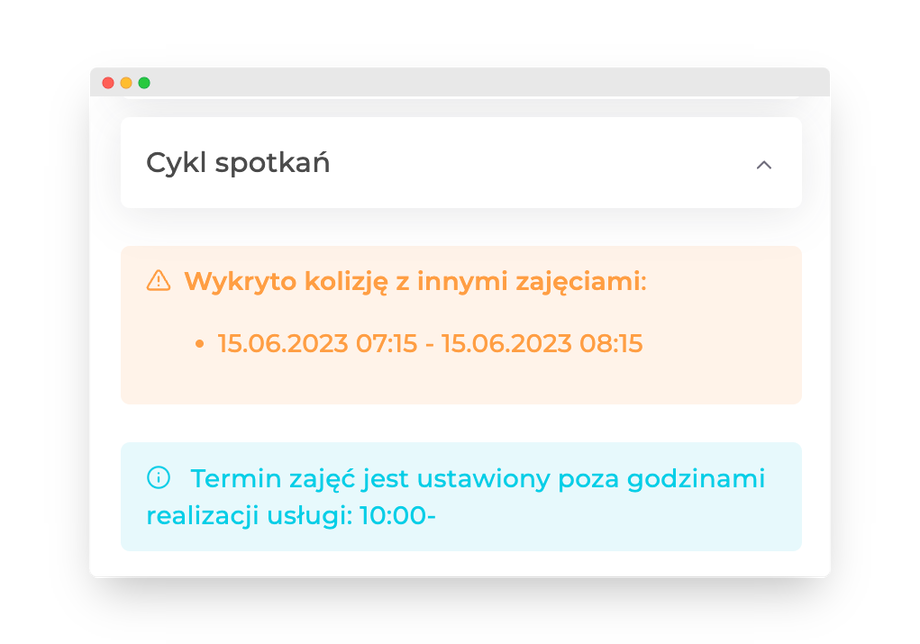 W razie potrzeby, wyświetlą się ostrzeżenia o kolizji z innymi spotkaniami, lub przekroczeniu godzin realizacji usługi.