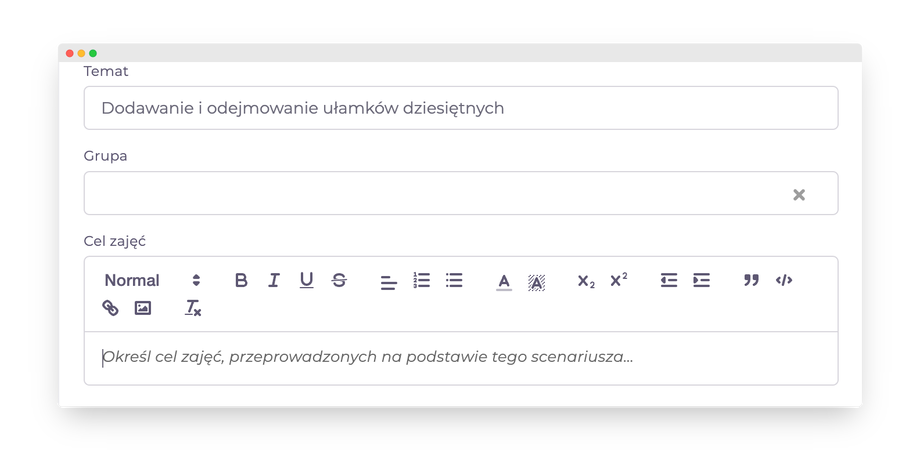 Scenariusz zawiera informacje na temat organizacji Twoich zajęć i szczegółowy opis ich realizacji. Oprócz tematu, grupy docelowej możesz określić też cel zajęć.
