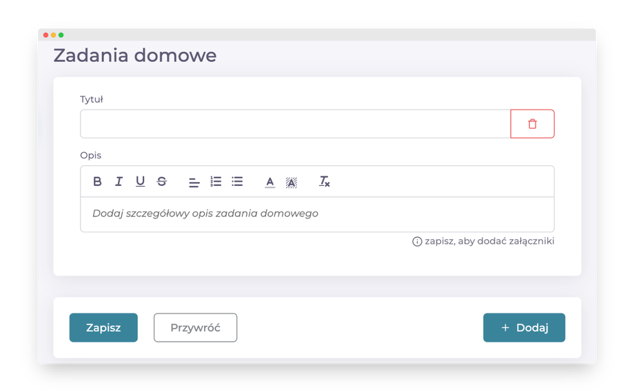 Można stworzyć przykładowe zadania domowe odpowadające tematowi scenariusza. Wybrane zadania domowe będziesz mógł zadać uczniowi w widoku spotkania.