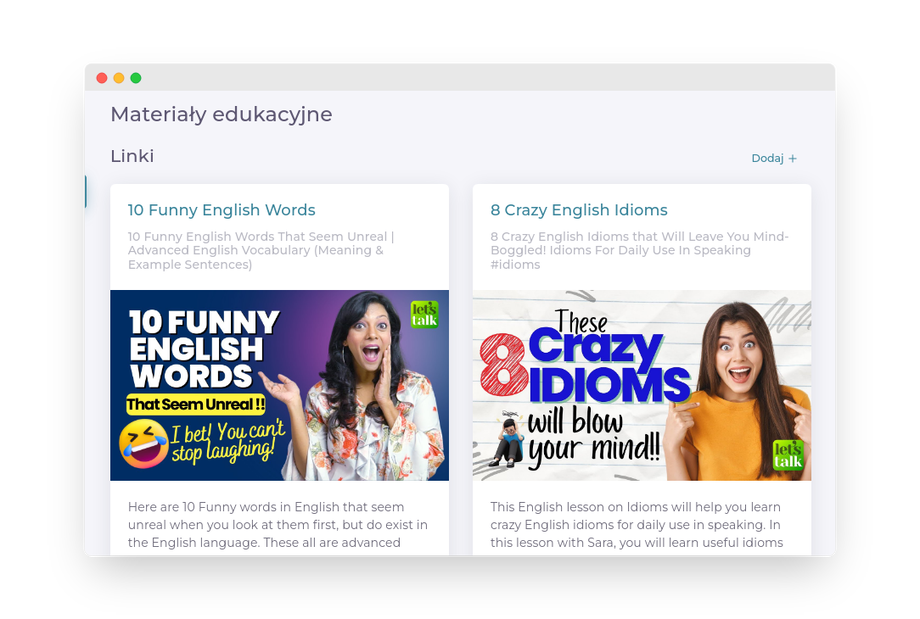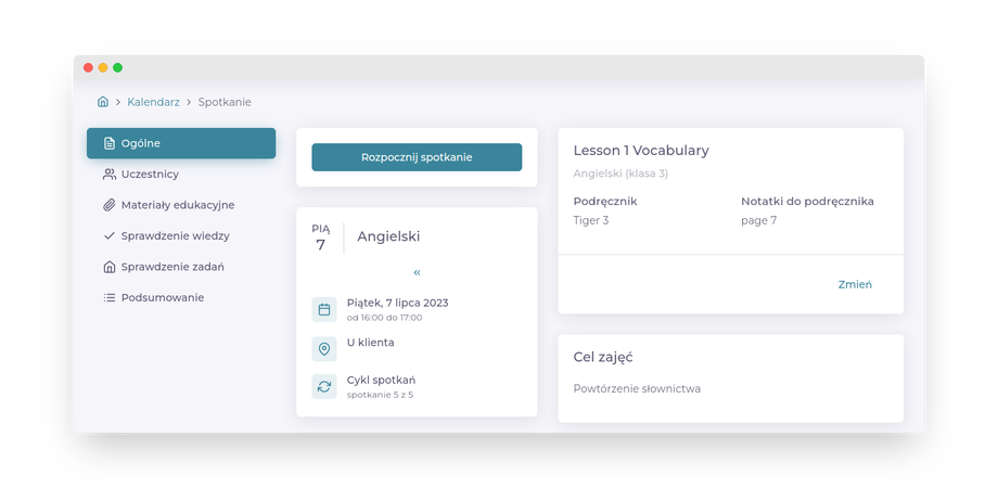 W widoku spotkania jako nauczyciel możesz zapoznać się z jego szczegółami. Możesz w tym miejscu dzielić się z uczniem materiałami dydaktycznymi i zadać mu zadanie domowe. Na koniec możesz spisać podsumowanie, które będzie udostępnione profilu ucznia.