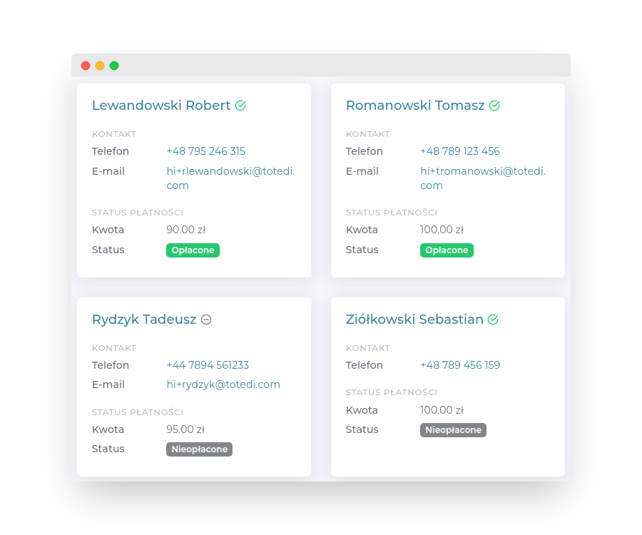 W sekcji Uczestnicy znajdziesz listę uczniów, zapisanych na zajęcia. Klikając w imię i nazwisko ucznia możesz szybko przejść do profilu ucznia w Totedi, a w status płatności, łatwo dodać wpłatę za zajęcia.
