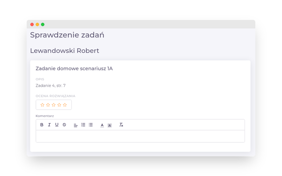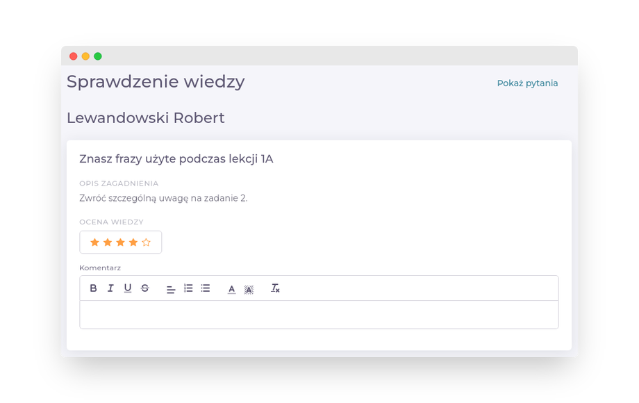 Nauczyciel może ocenić wiedzę ucznia za pomocą gwiazdek w skali od 1 do 5, oraz dodać komentarz do oceny.