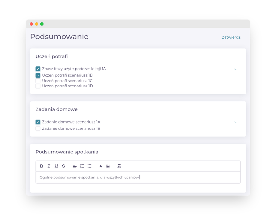 Miejsce, w którym podsumowujesz spotkanie, w celu udostępnienia tych informacji uczniowi i/lub jego opiekunowi.
