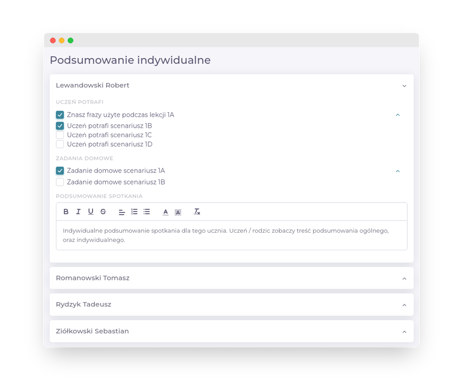 W tej zakładce wyświetlą się punkty zaznaczone w poprzedmin podsumowaniu spotkania i pogrupowane względem uczniów.