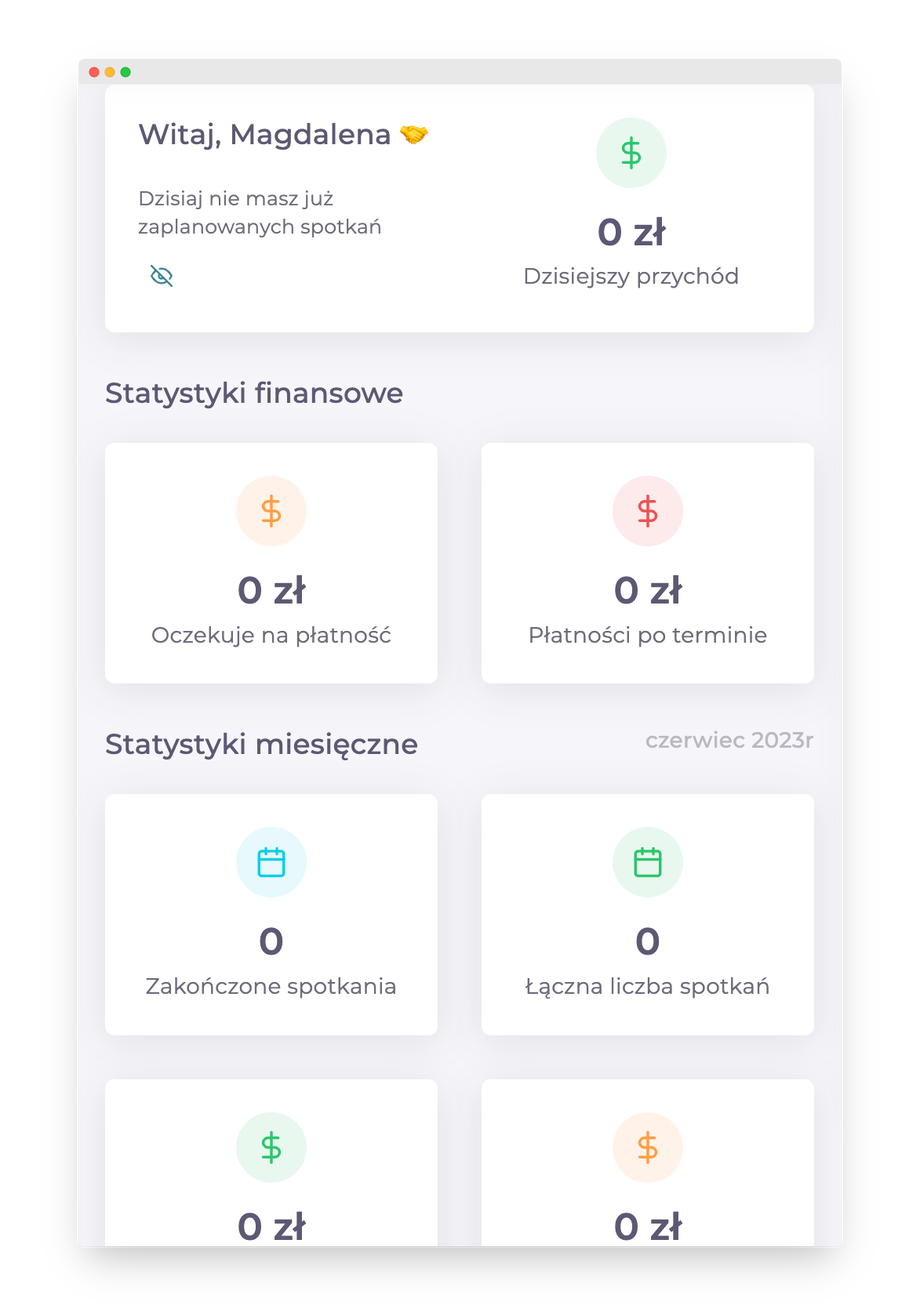 To miejsce, gdzie znajduje się skrót dzisiejszego planu dnia, podstawowe statystyki z bieżącego miesiąca, oraz podstawowe informacje finansowe.