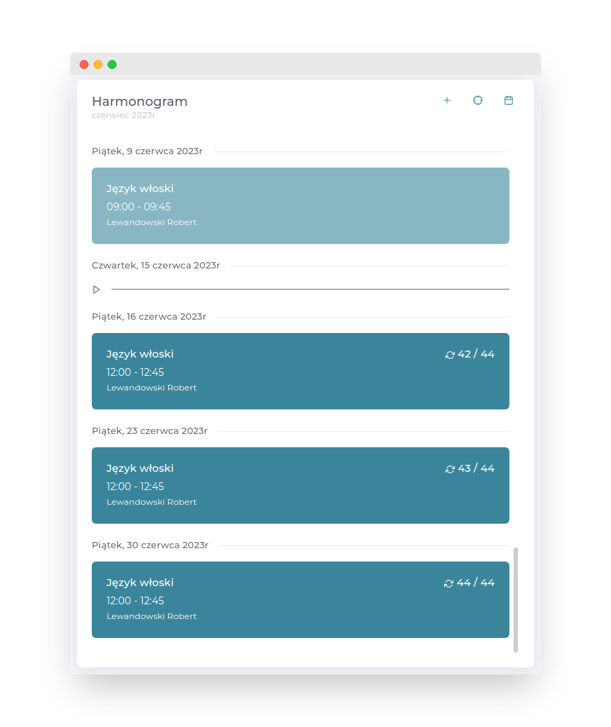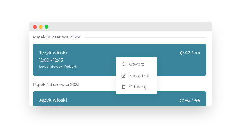 Miejsce z listą Twoich spotkań. Klikając w jedno z nich wyświetli Ci się menu. Możesz wyświetlić widok spotkania, edytować je oraz anulować, informując o tym swoich klientów.